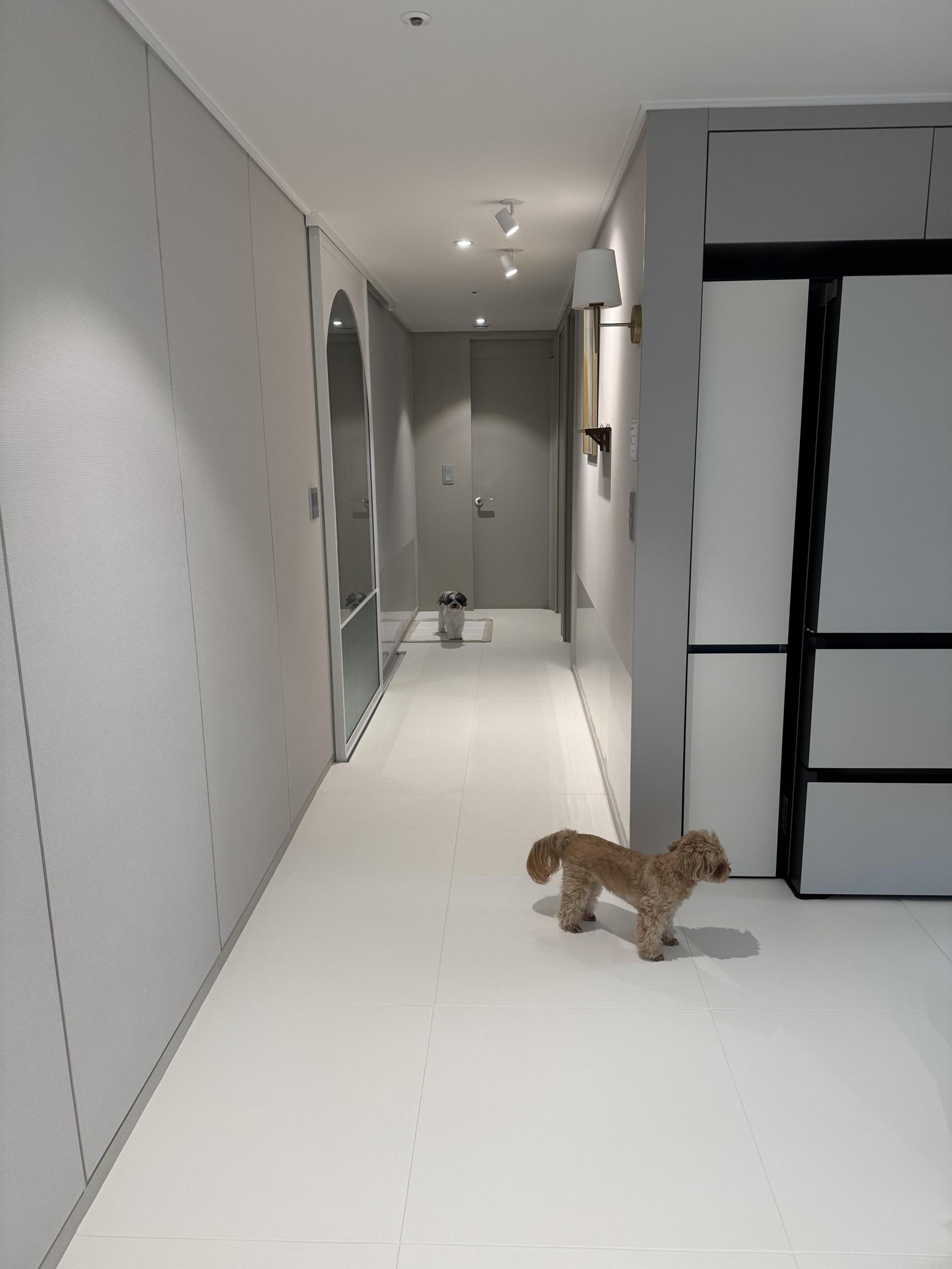 시공 전에는 강아지가 뛰어다니는 거실과 복도에 부분적으로 강아지매트를 깔아 둬서 조금 정리가 안 된 느낌이었다면, 시공 후(거실, 복도, 주방) 집이 너무 깔끔해졌고, 출산 후 딱딱한 바닥 때문에 발에 무리가 가서 슬리퍼를 신고 다녔는데 푹신해서 너무 좋네요! 인테리어는 덤으로~☺